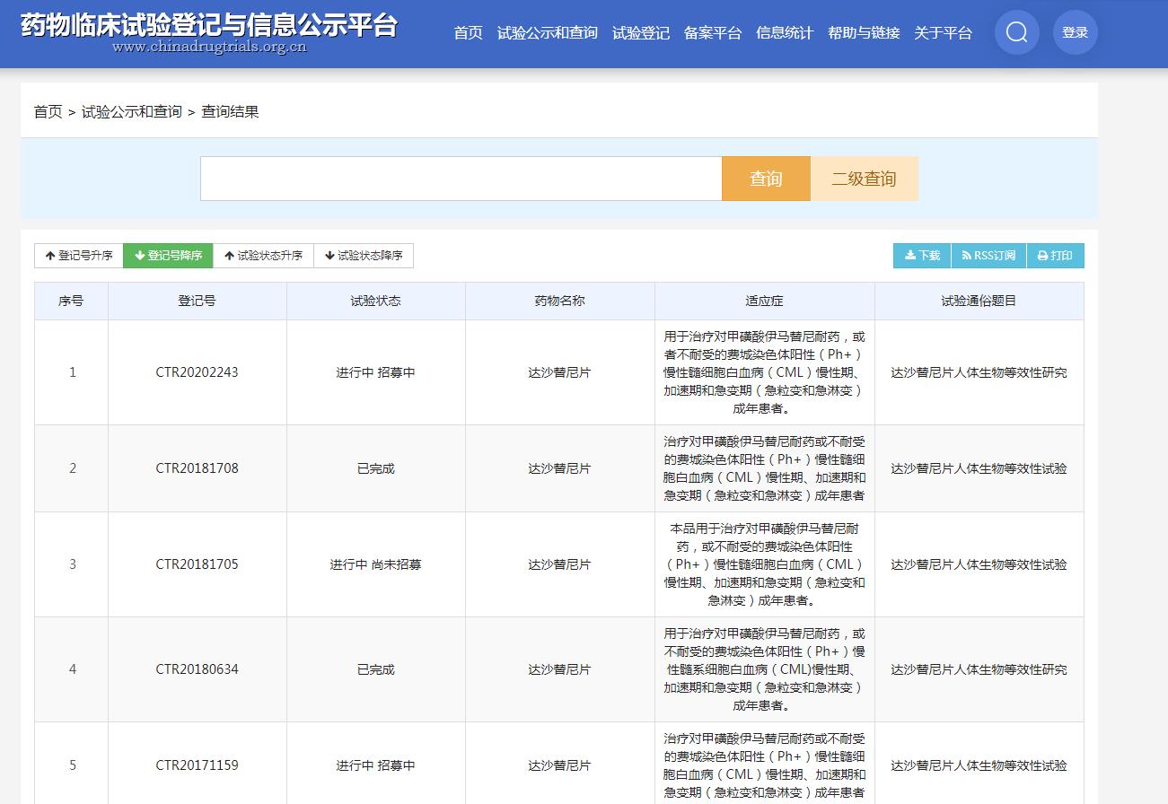 國家藥品監督管理局于2011年8月批準達沙替尼原研藥在國內上市,2013年9月正大天晴達沙替尼首仿藥獲批上市,并且在2019年12月提交一致性評價申請,現處于“在審批”階段?,F在,在國內有BMS原研和正大天晴的首仿上市。 查詢CDE臨床試驗登記平臺可知,除了正大天晴、石藥歐意登記BE研究之外,南京優科已完成BE研究,而山東新時代今年登記,現在正在進行中。